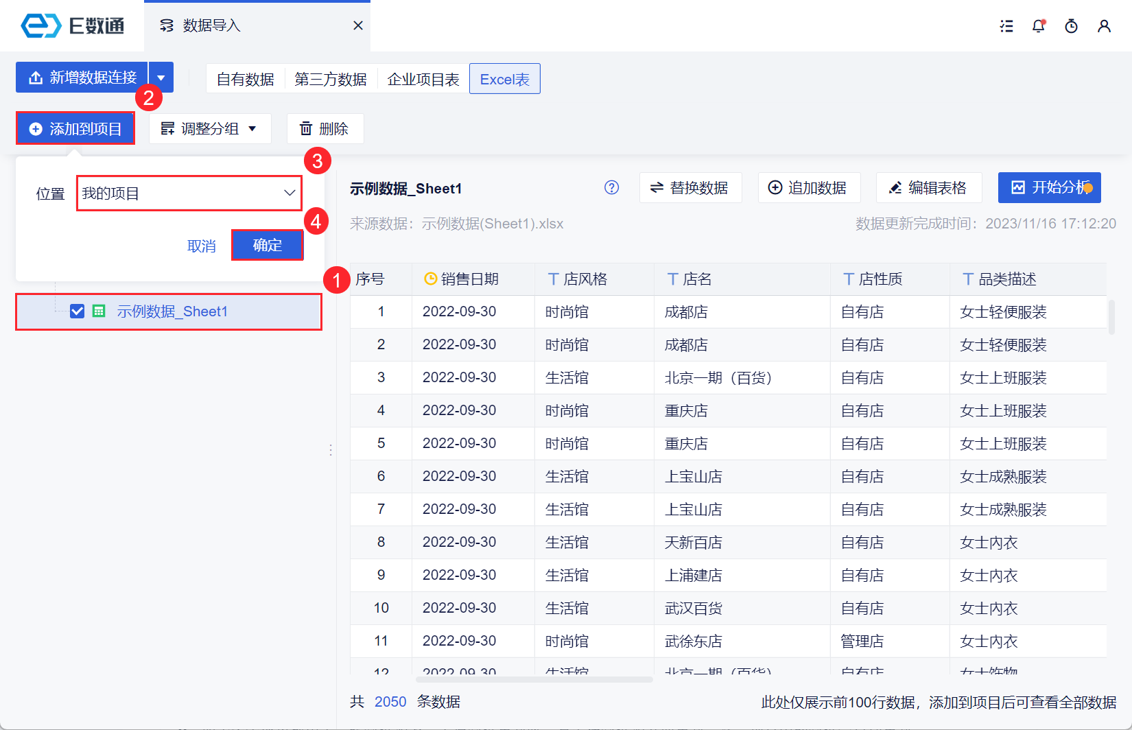 选择示例数据,点击「添加到项目」,选择好位置后,点击「确定」。如下图所示: