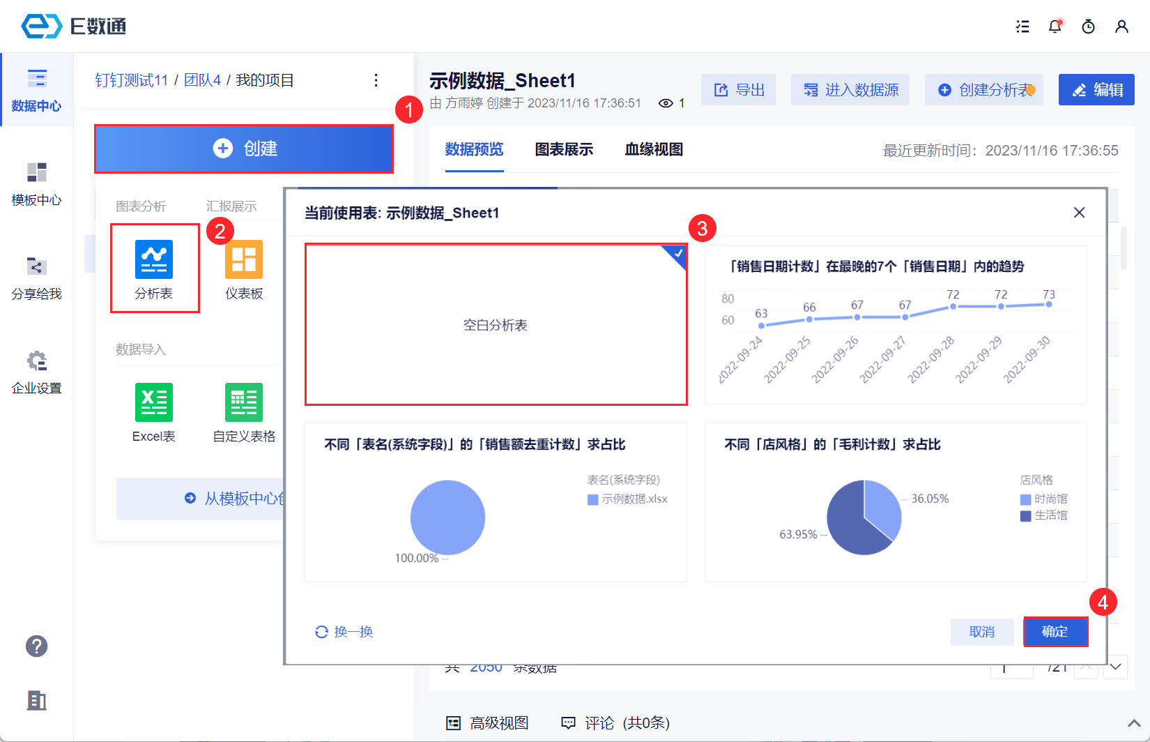 在项目中,点击「创建>分析表」,并选择创建一张空白的分析表。如下图所示: