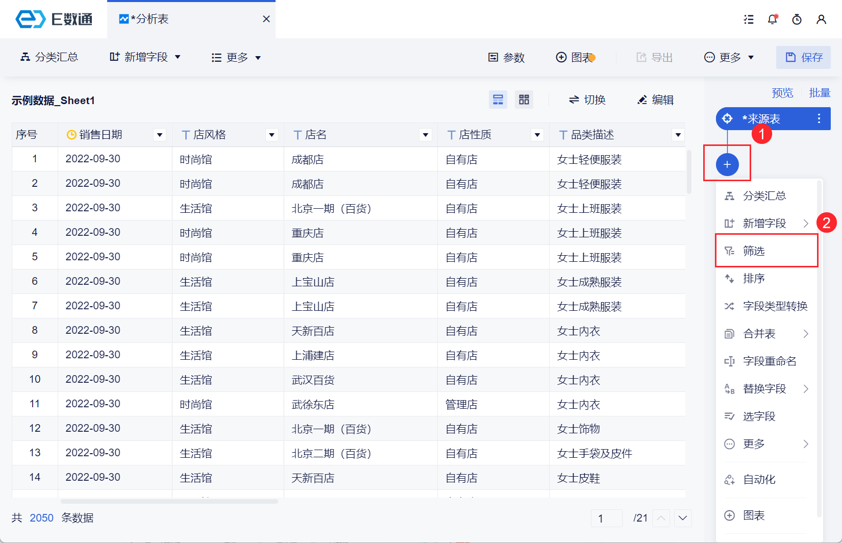 在 添加数据 中,我们已经上传 Excel 表格至 E数通,下一步就是对数据进行处理和分析。
