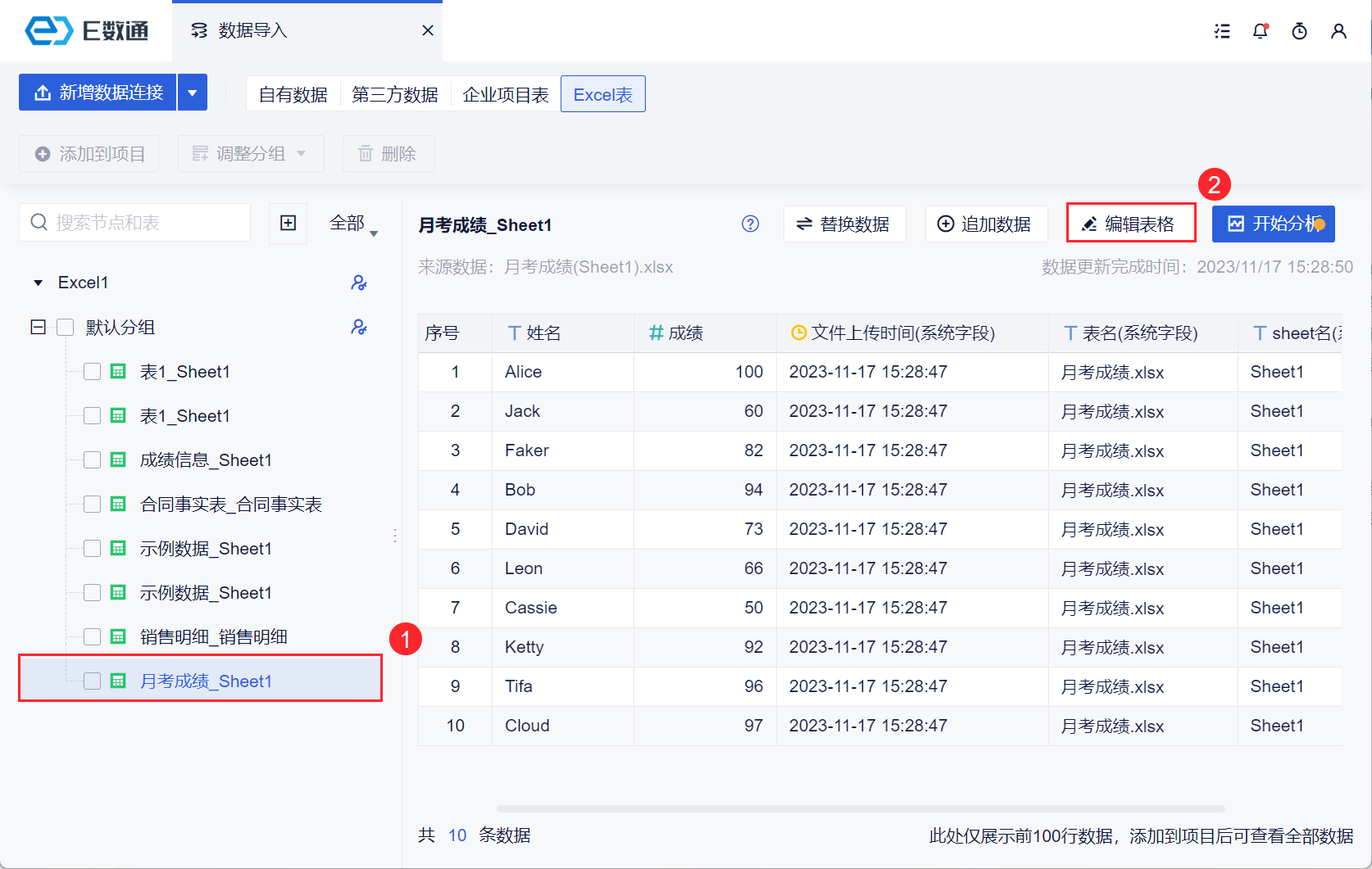 若想要对已有的 Excel 表进行编辑,在数据源界面,选择该表,点击「编辑表格」按钮。如下图所示: