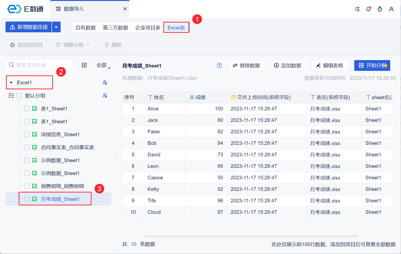 2)保存的表格放置在团队的 Excel 数据源的节点下,可以作为 Excel 表使用。如下图所示: