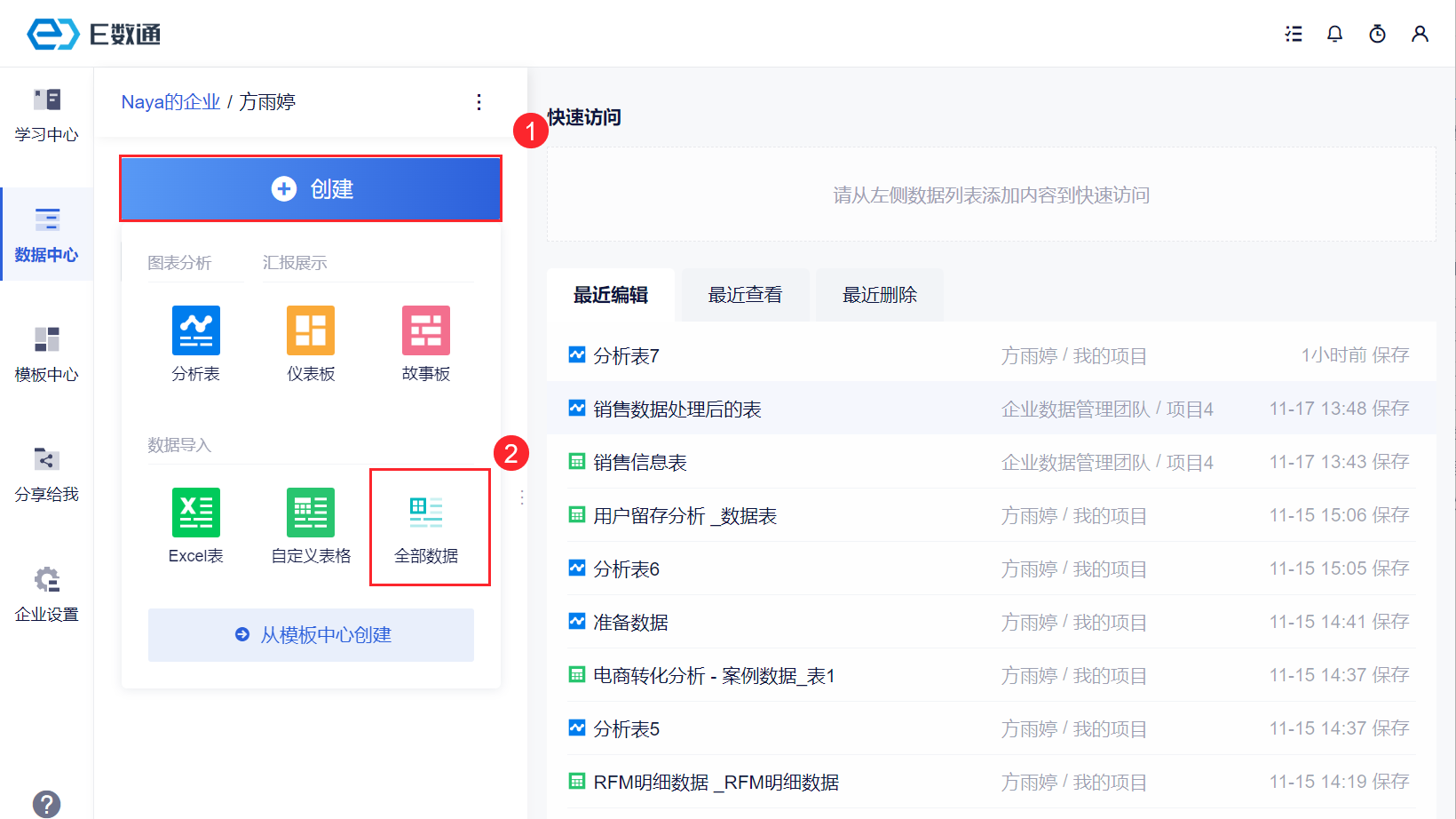 1)在团队中点击「创建>全部数据」,进入数据源界面。如下图所示: