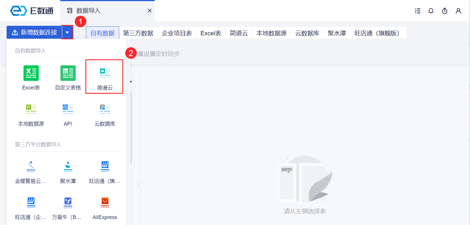 E数通支持获取简道云数据源,轻松进行海量数据的处理和分析。