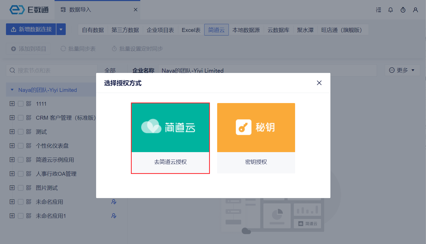 | 进入数据源页面,选择授权方式 | 选择简道云数据导入到 E数通时,账密授权方式;
