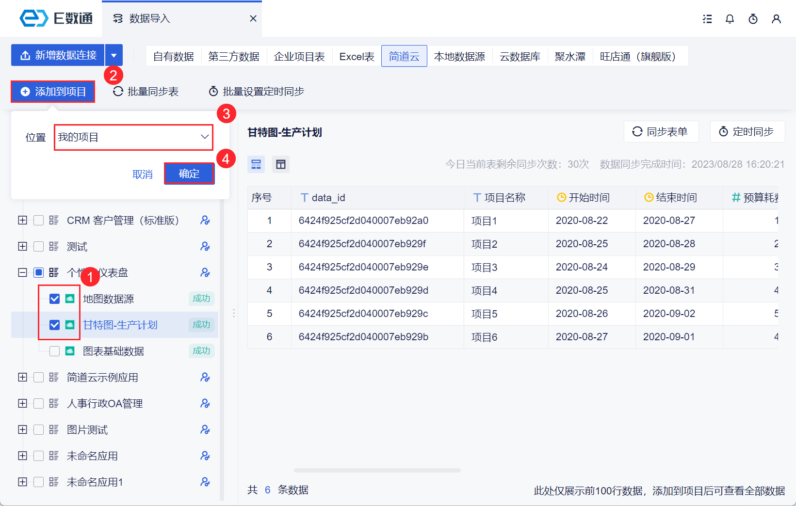 本次操作是手动全量同步,E数通还支持批量同步,定时同步、实时同步简道云数据。
