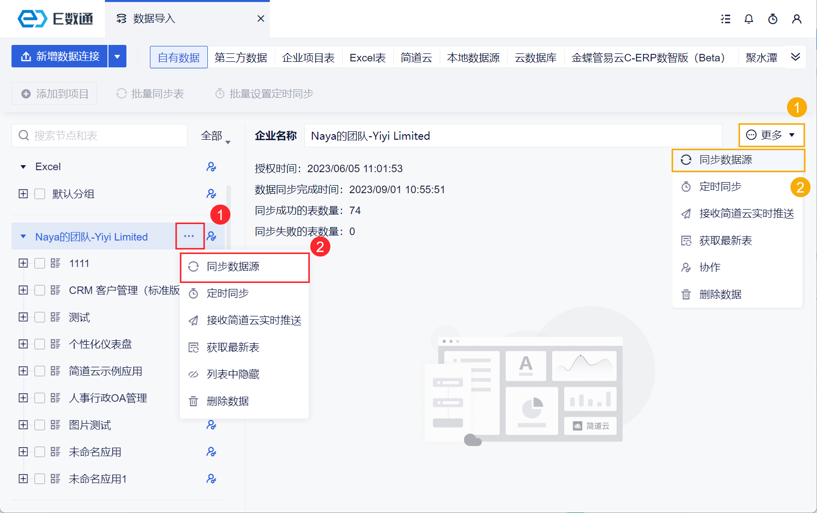 点击后获取当前数据源最新列表,不含字段和字段值。例如简道云中删除某张表单,在点击「获取最新表」后,E数通中的这张表单数据也同步删除了。