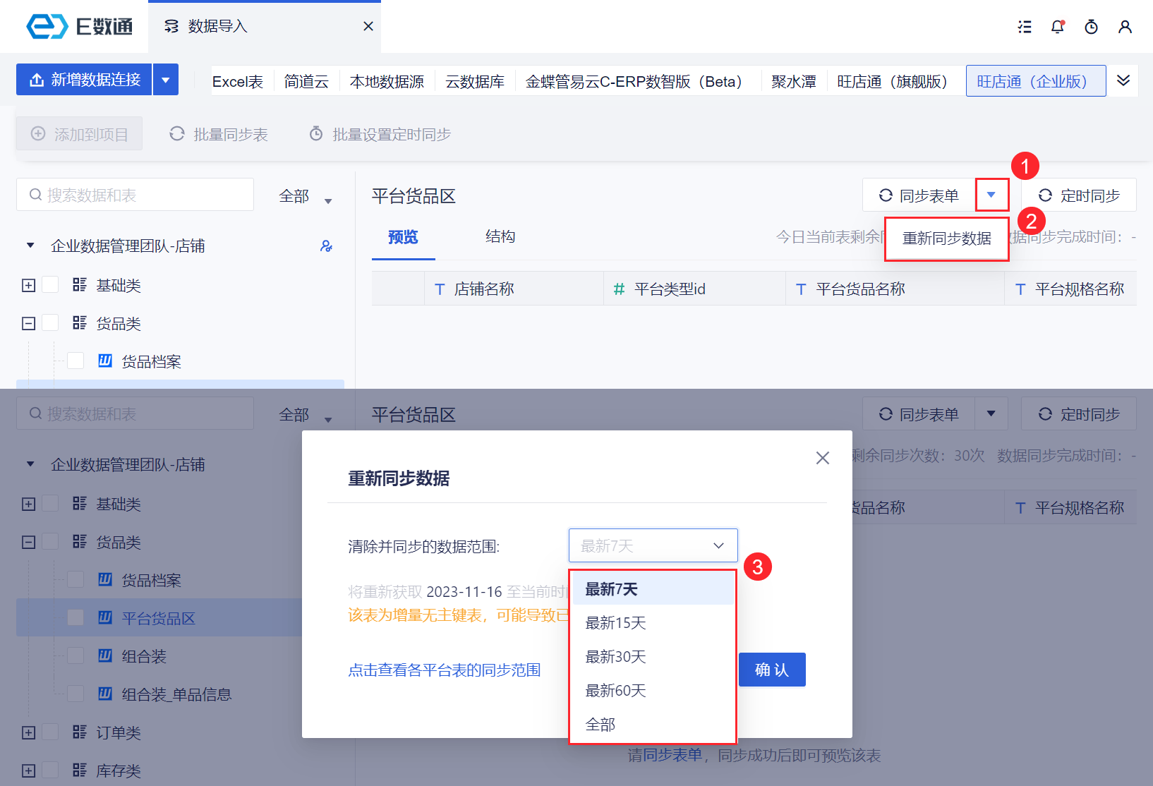 在 电商数据源 中,可能会出现历史数据调整的情况,但手动同步不能将错误的历史数据覆盖。此时可以使用「重新同步数据」功能,将当前的数据清除并重新同步一个新的时间范围内的数据,如下图所示: