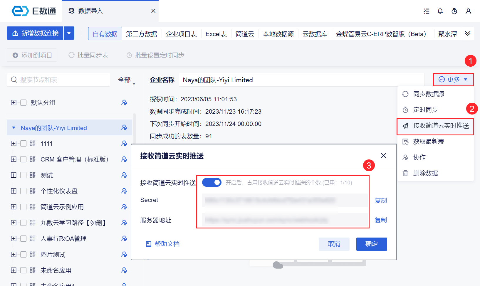 | 接受简道云实时推送 | 仅简道云数据源可用。可以实现简道云填写的表单数据能够实时对接同步到 E数通中。 | |