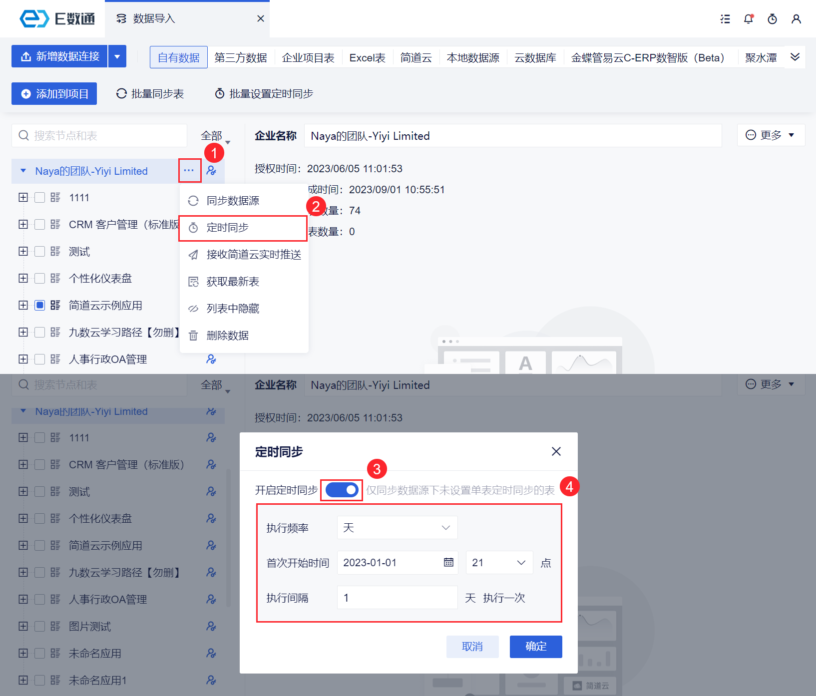 选择企业,点击「定时同步」,设置同步开始时间和执行频率,点击「确定」即可按照规则执行定时更新,如下图所示: