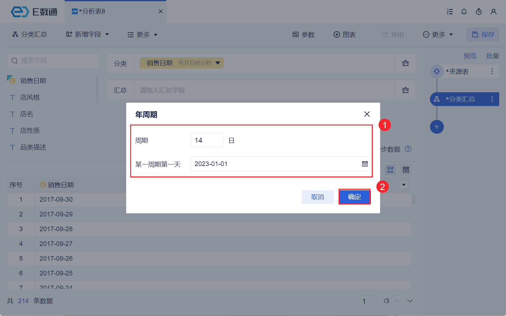 2)特别说明「年周期」,可以自定义起始日期以及周期,以分类汇总步骤为例,拖入一个日期字段,下拉选择「年周期」,如下图所示: