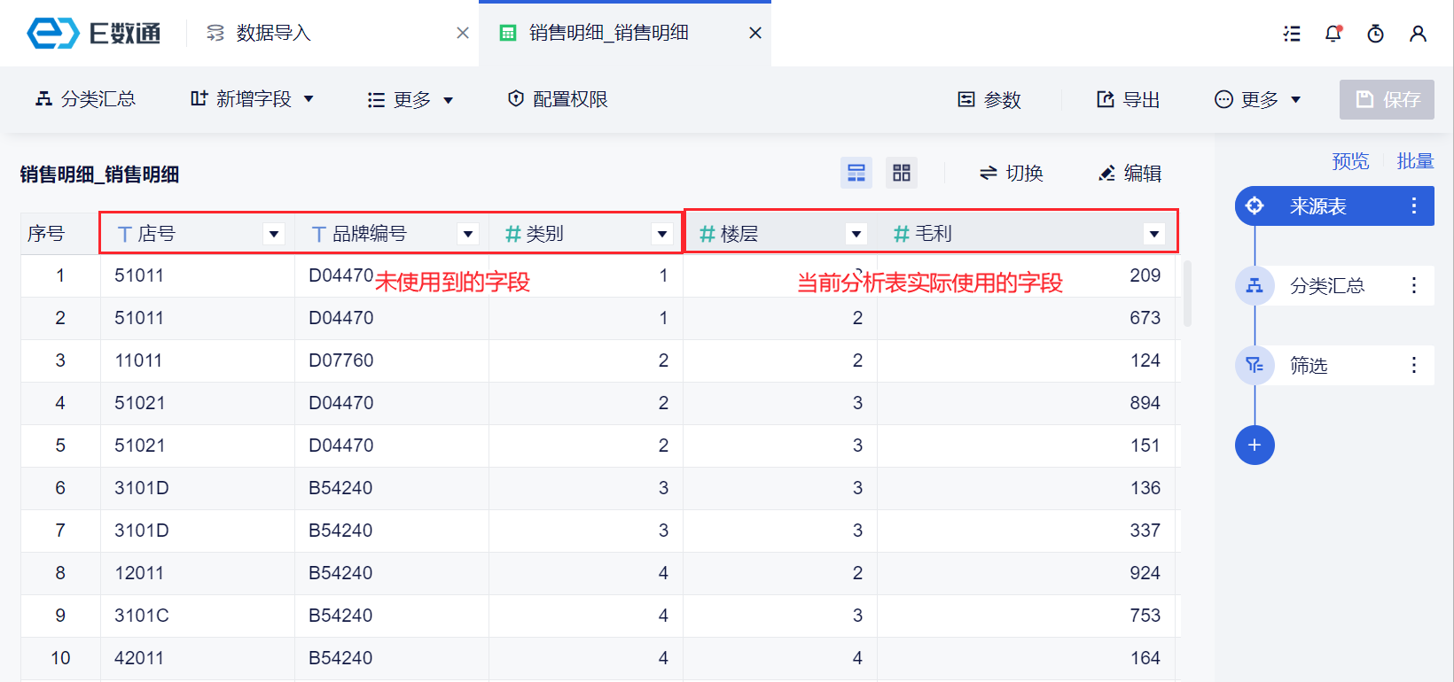 | 新增字段 | 在不影响已有字段的情况下,利用已有字段可以计算得到新的一列。 | 新增字段 分类赋值 条件赋值 累积值 排名 同环比 占比 离群分析 动态字段 |