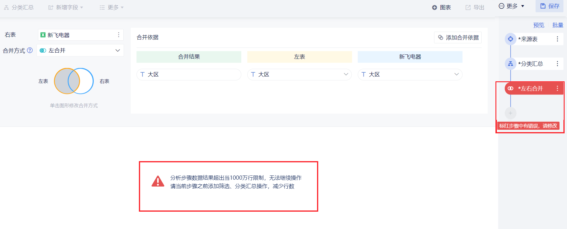 分析步骤数据结果超过 1000 万行限制,将无法继续操作,请添加「筛选」或者「分类汇总」等操作减少行数