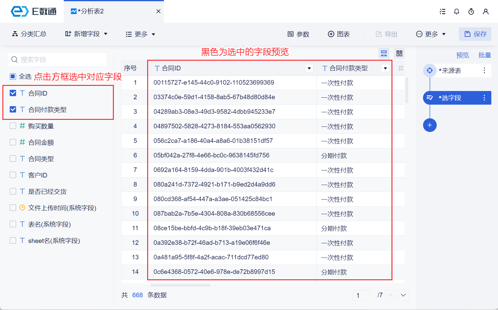 在进行分析时,第一个步骤展示为来源表。字段较多时,我们只需要选取几个字段参与分析即可。