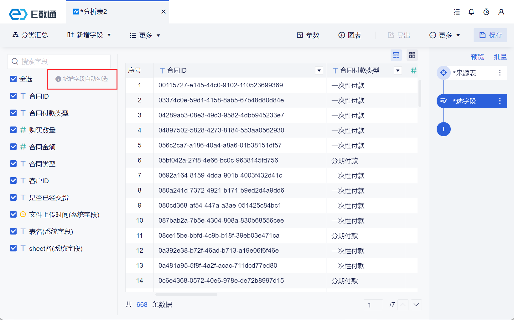 制作好分析表后,在一些步骤前增加了新字段,想要向后继续传递参与计算,可以使用「新增字段自动勾选」功能。