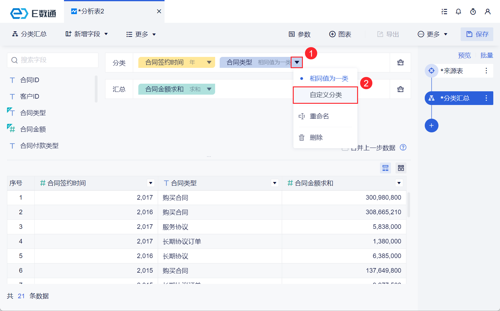 例如,用户有一张合同签单表,想将合同类型分为「长期订单」和「短期订单」,并统计每年两种合同类型的合同金额有多少。