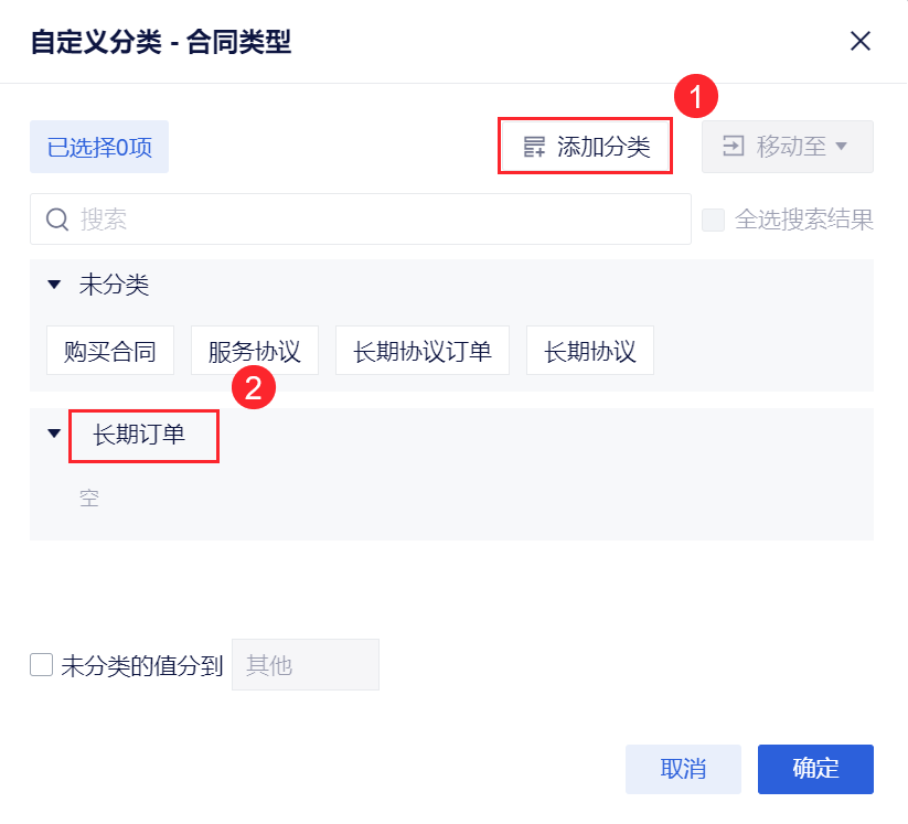 1)选择「合同类型」进行「自定义分类」,如下图所示: