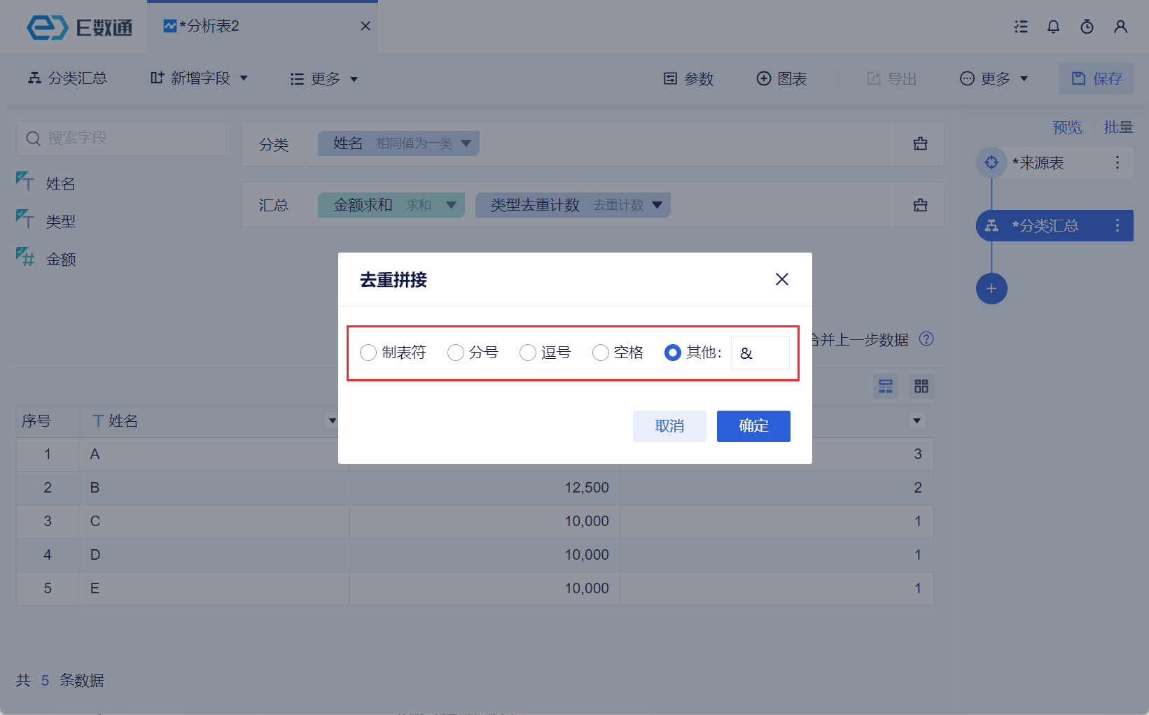 2)将每个员工的类型进行拼接,点击字段下拉,选择「去重拼接」,如下图所示: