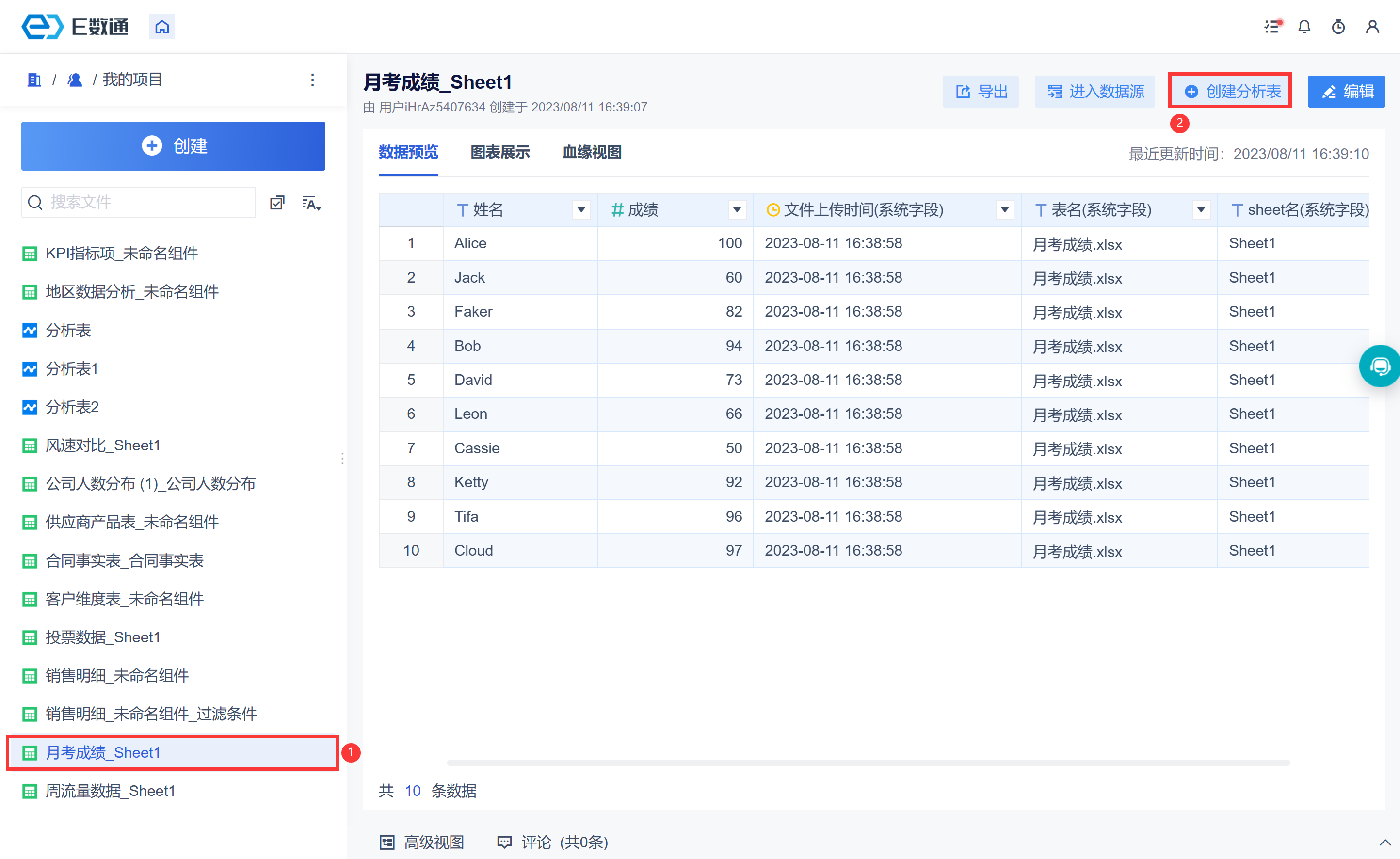 1)下载示例数据:月考成绩.xlsx,并上传到E数通。