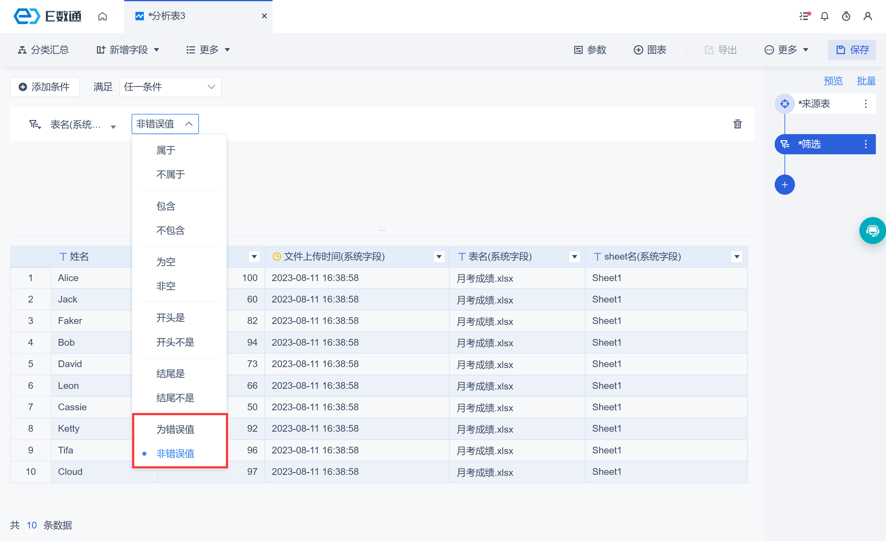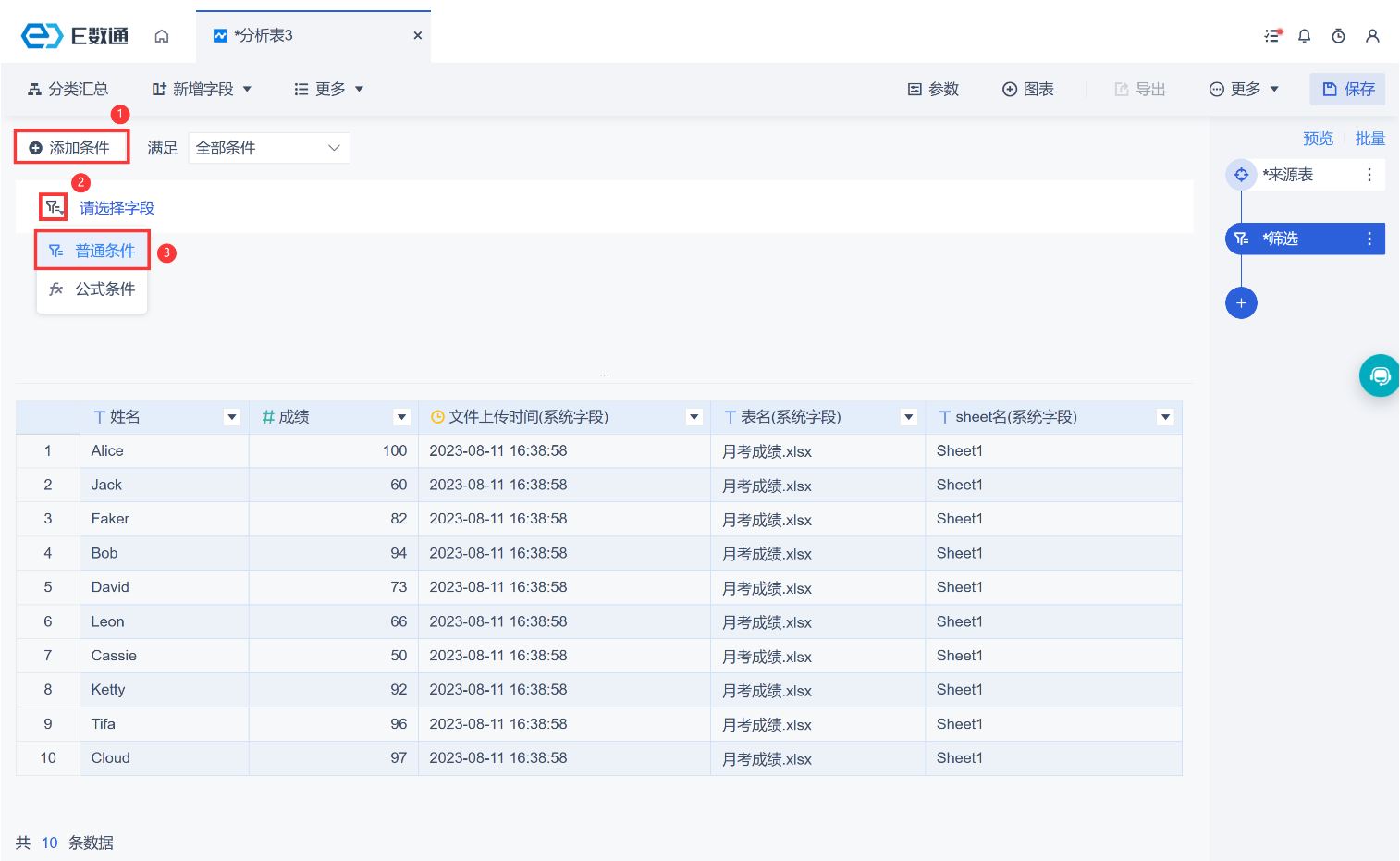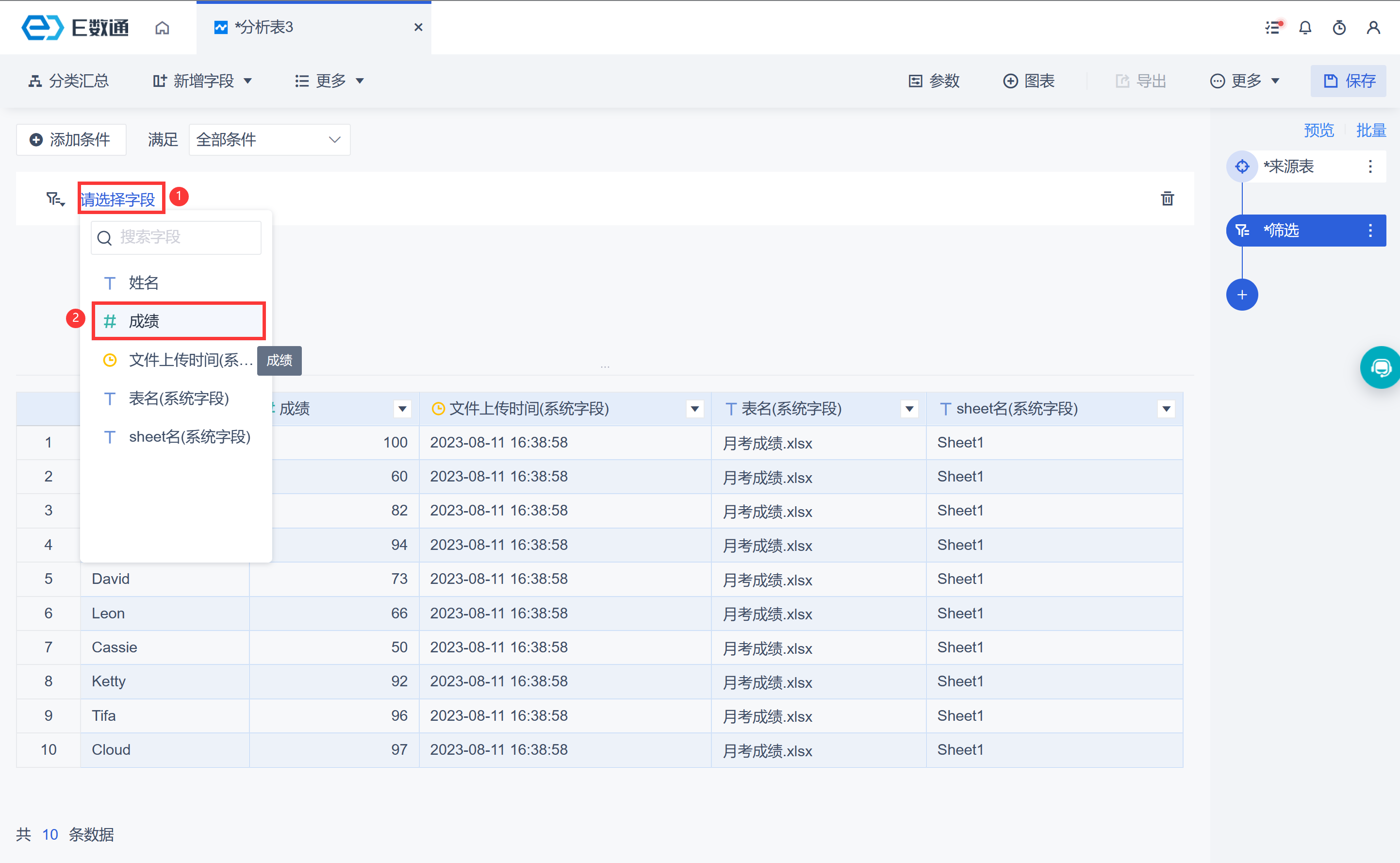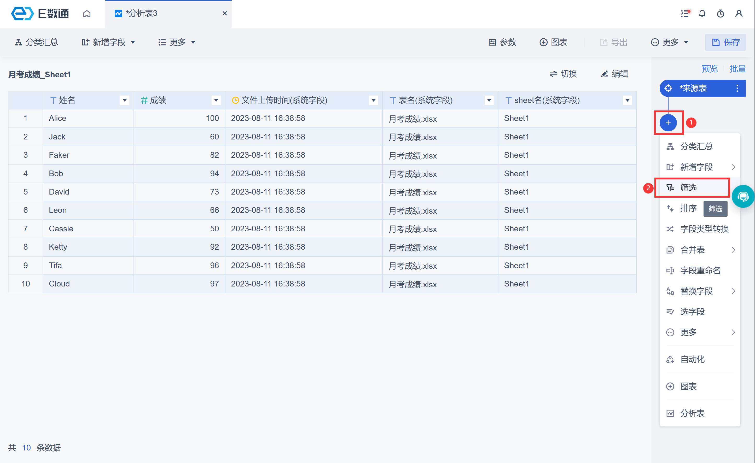 数据在分析表里面处理时,经常需要根据条件过滤掉一些数据,例如,筛选出成绩大于70的数据,这个数据过滤就是通过添加筛选步骤实现的。