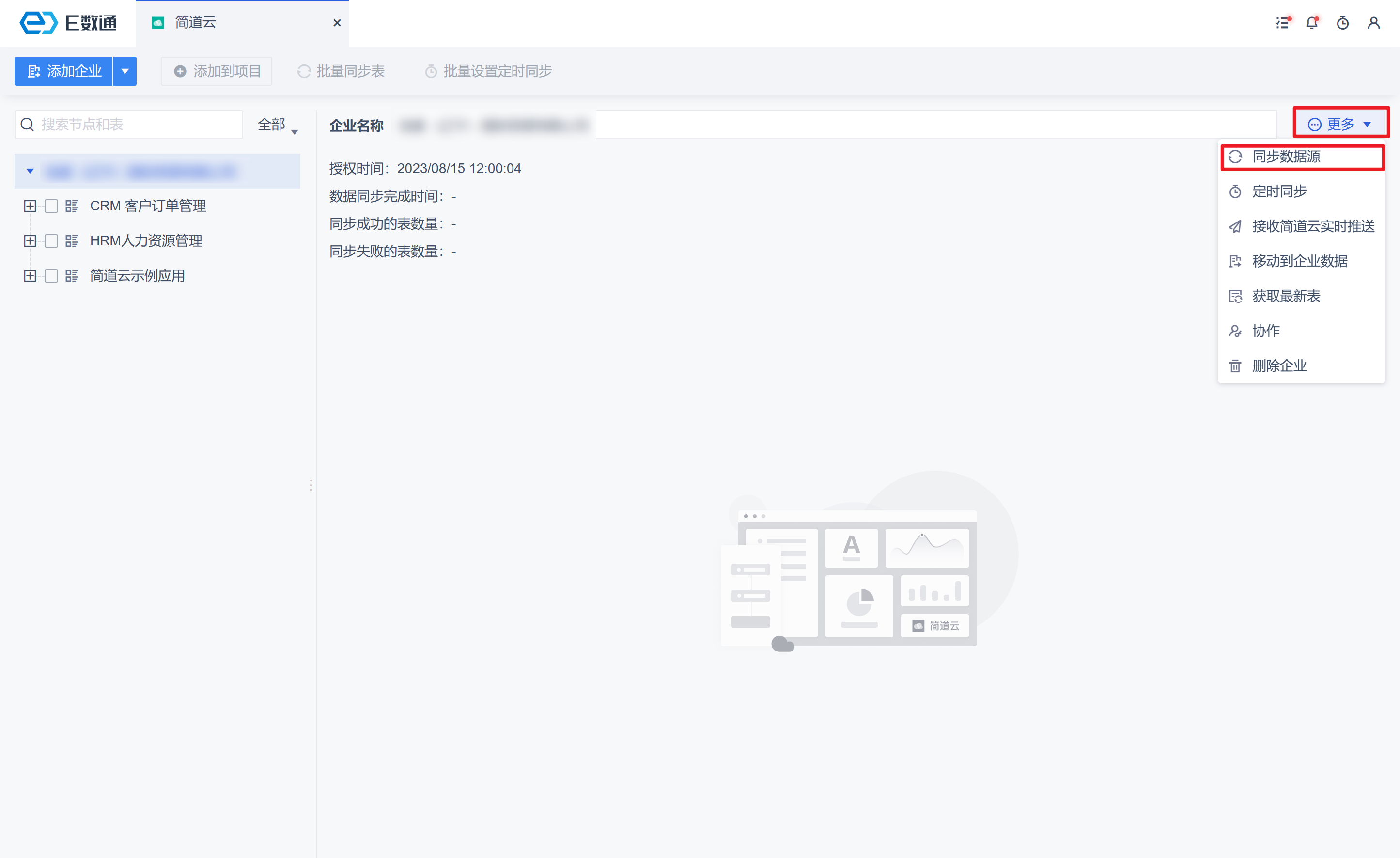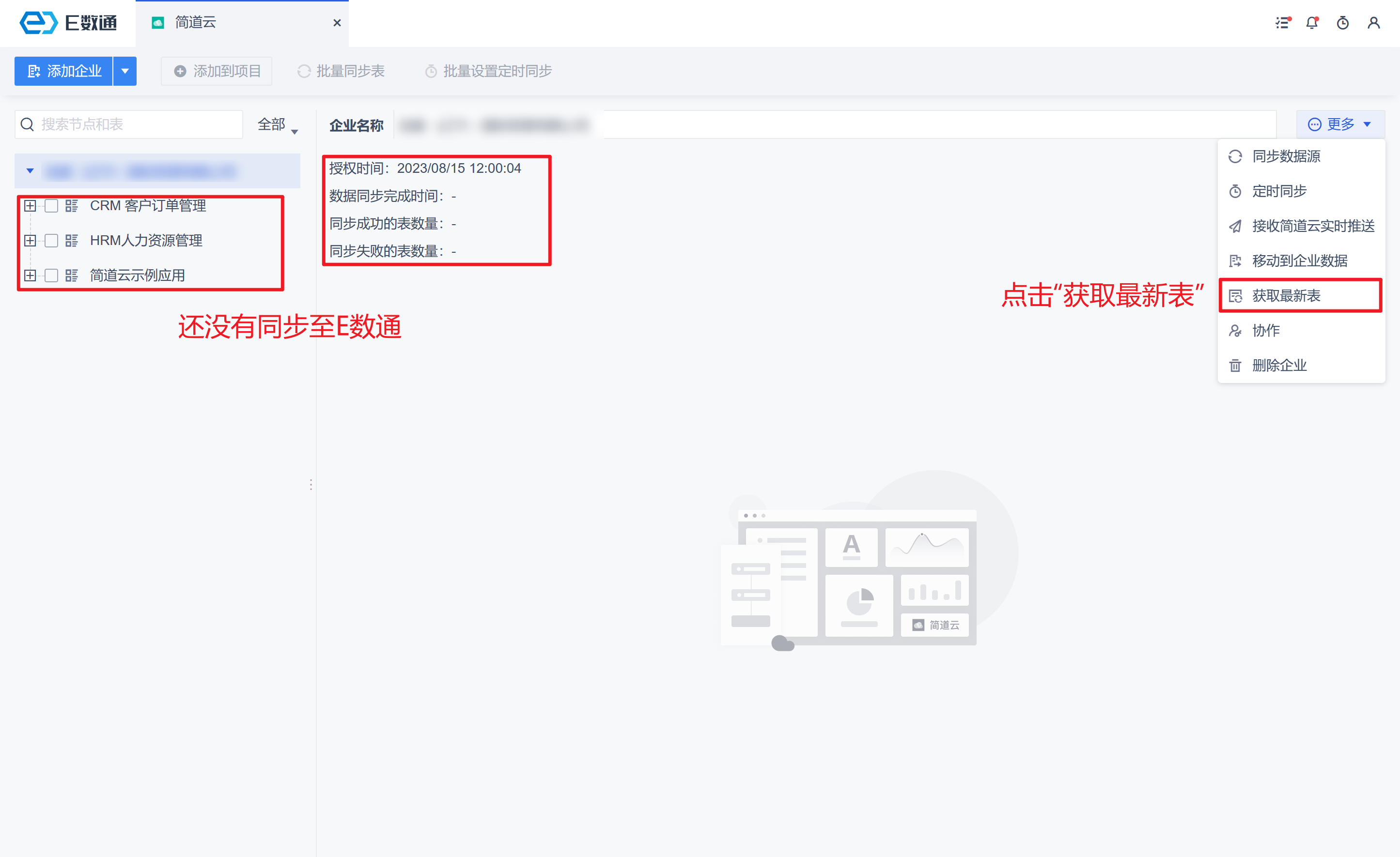 • 点击后获取当前数据源最新列表,不含字段和字段值。例如简道云中删除某张表单,在点击「获取最新表」后,E数通中的这张表单数据也同步删除了。