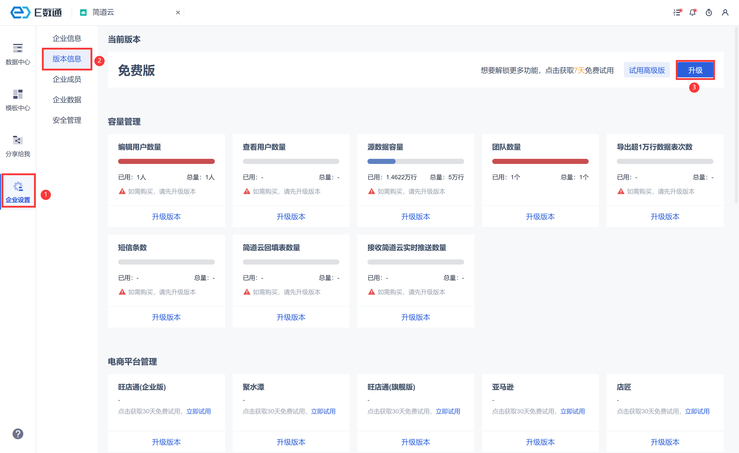 管理员在「企业信息>版本信息」中升级版本,详情参见文档:版本信息