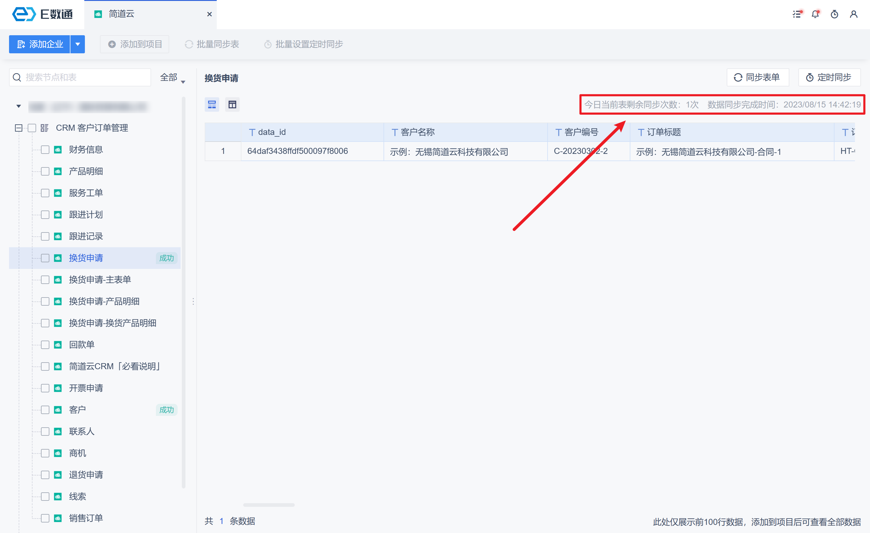 选择需要同步更新的企业,点击「同步数据源」,完成后,会显示数据同步的信息,如下图所示: