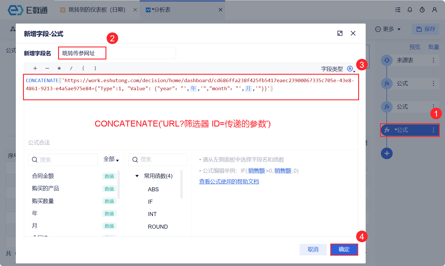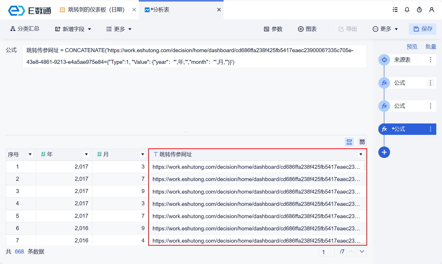 4)再新增一个字段,要将上面获得的仪表板 ID、筛选器 ID 以及传值的年、月拼接起来。