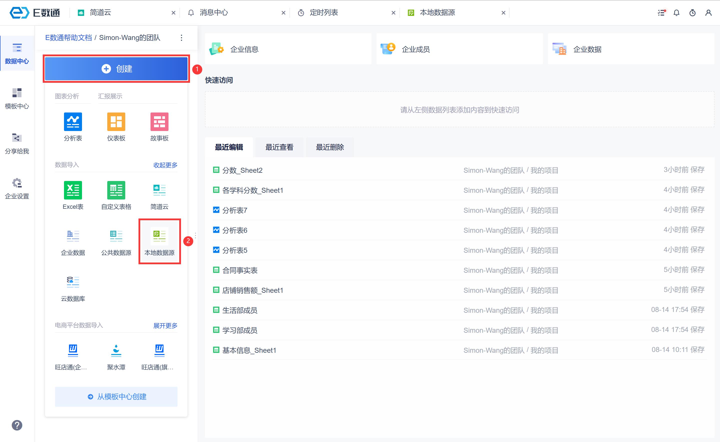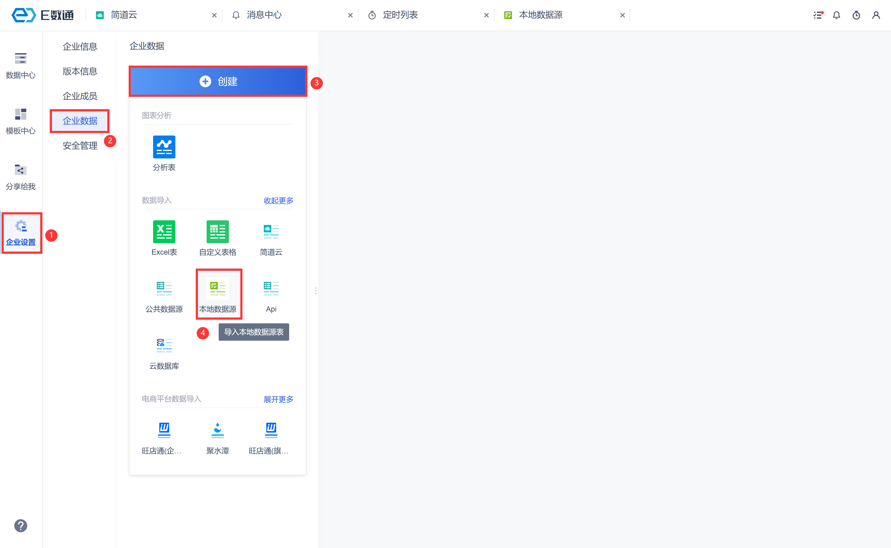进入企业数据界面,点击「创建>本地数据源」,如下图所示: