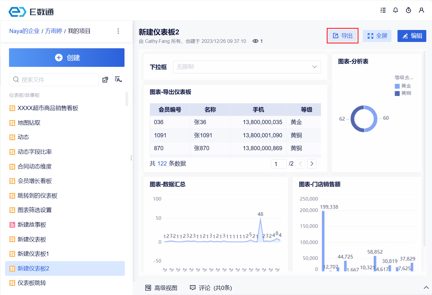 当用户需要将仪表板导出,保存数据和图表,进行一些其他处理或报告使用的时候,可以用到 E 数通的导出功能。