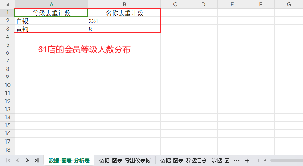 例如,门店销售额图表对 61 店 设置了联动,数据汇总表的数据为 61 店的会员等级人数,导出的 Excel 中为数据为 61 店的会员等级人数。