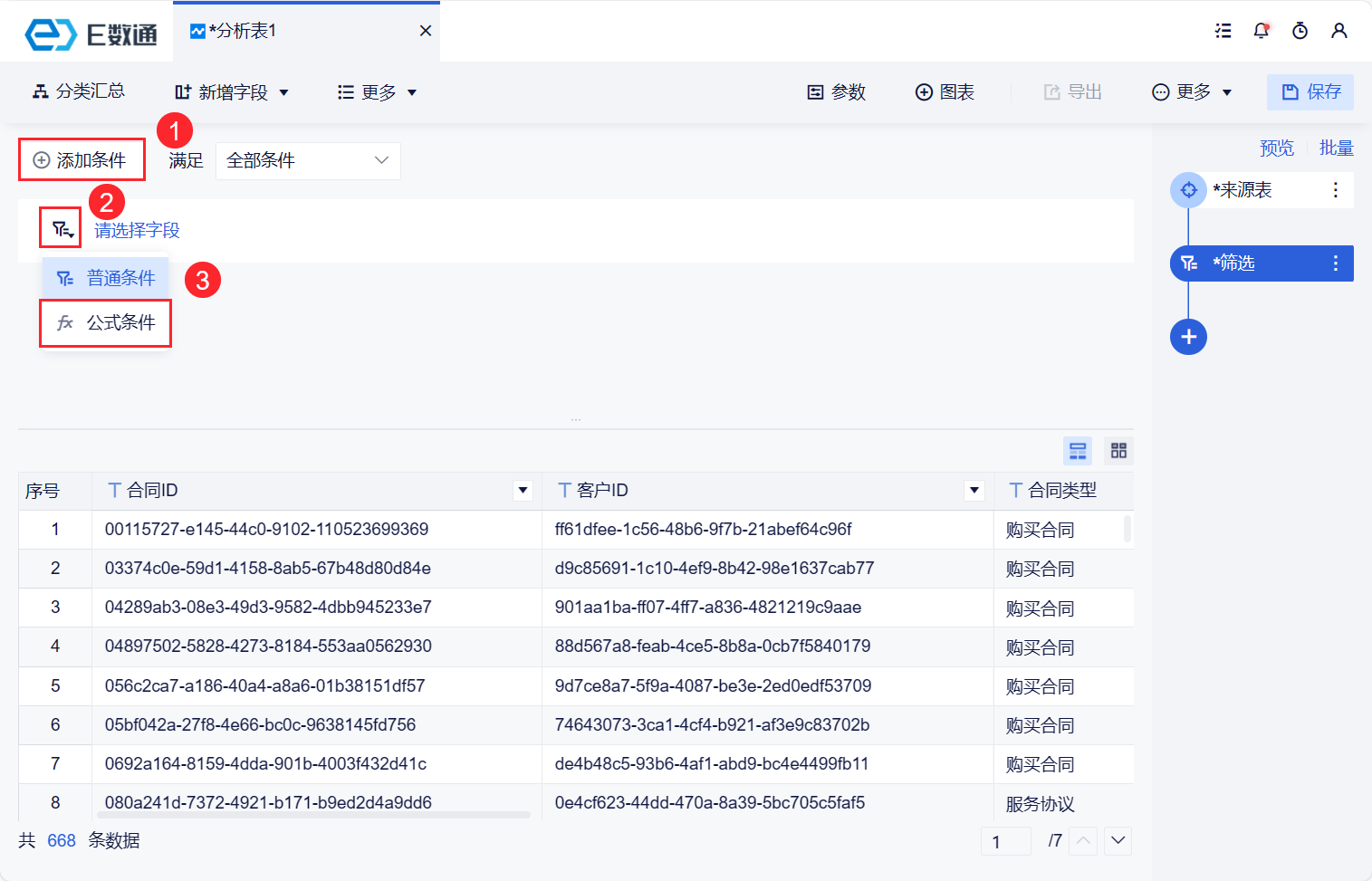 例如,希望快速过滤出「合同金额>3000」 并且「购买数量>10」的相关数据 。