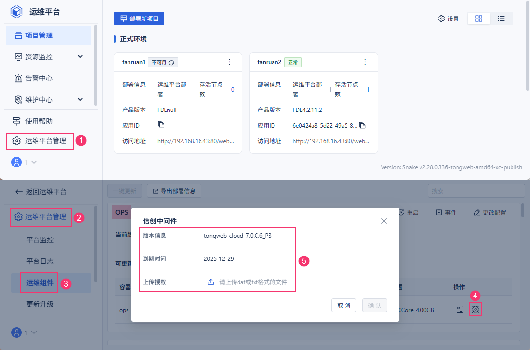 可通过运维平台「运维平台管理>运维组件」界面,在OPS容器的「操作」项中,通过「信创中间件」按钮查看中间件版本、中间件授权到期时间、上传更新授权