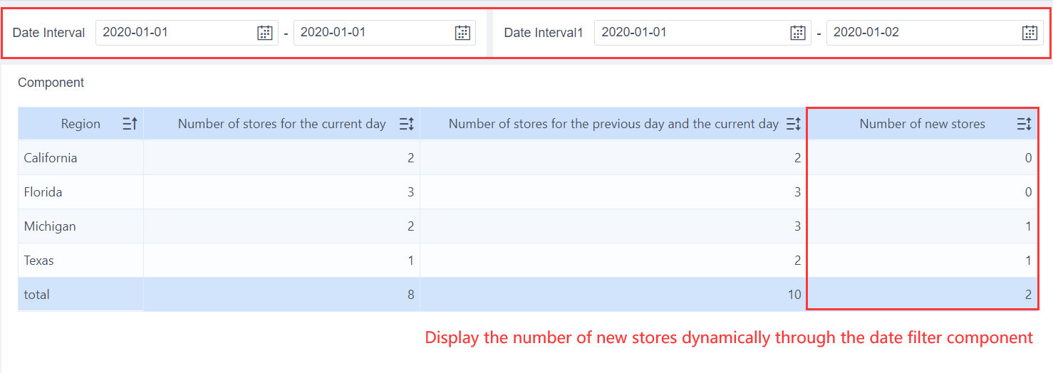 4. Set the filter time of Date Interval to 2020/01/01, and the filter time of Date Interval 1 to being from 2020/01/01 to 2020/01/02 (the total number of stores for the current day and the previous day). At this time, the Number of new stores field will automatically display the filtered number of new store for the current day.