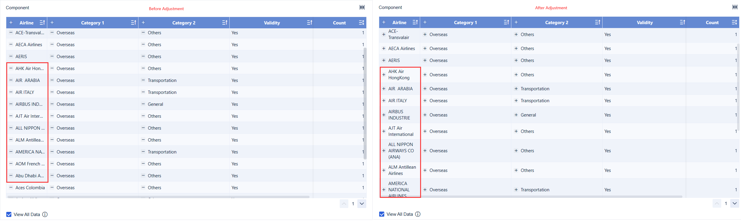 3. Drag Airline, Category 1, Category 2, and Validity from the left area into Dimension and Count from the left area into Indicator, as shown in the following figure.