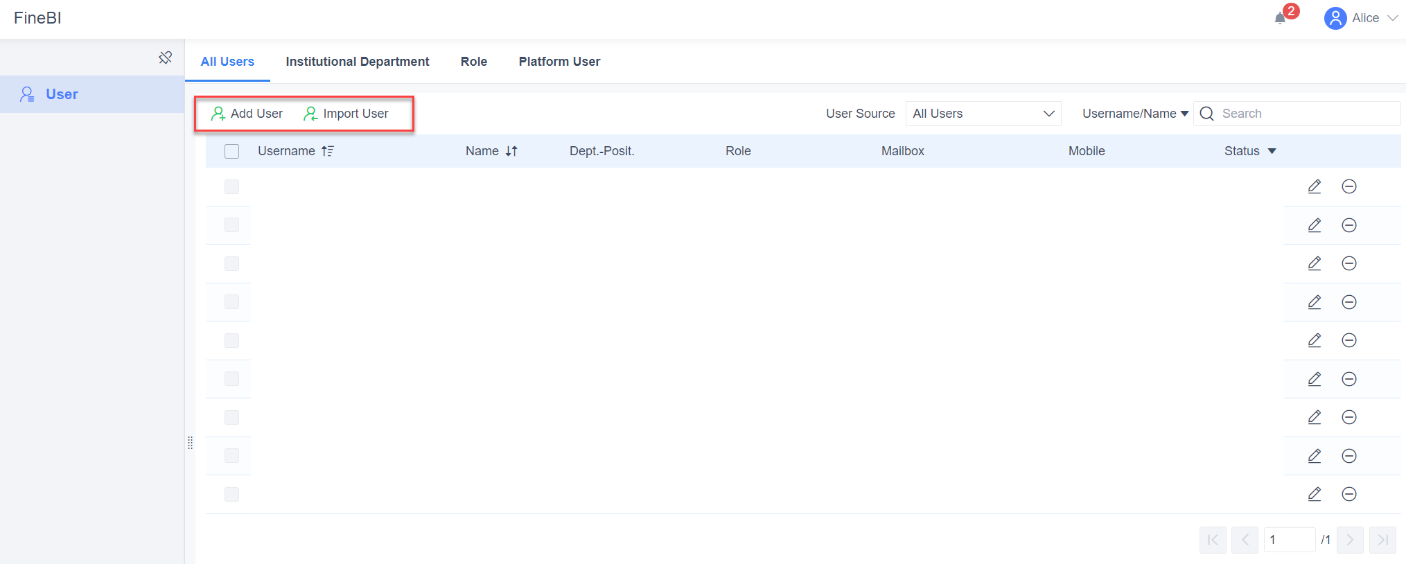 User synchronization is highly dependent on the data source. If there is something wrong with data source, such as being maliciously cleared of database tables, the users synchronized to the system will be cleared, and the operation cannot be reversed. Therefore, FineReport provides a synchronous circuit breaker strategy. In FineBI of version 5.1.15 and later, a Synchronize Abnormal Data Interruption button is added. After the admin enables it, you can set the synchronization to stop when the number of users decreases by X%, and X is a positive integer from 1 to 100. For example, if there were originally 100 synchronized users (excluding manually added/imported users) in the system and the decrease rate is set to 30%, then synchronization will be stopped when at least 30 (100*30%) users are cleared out.