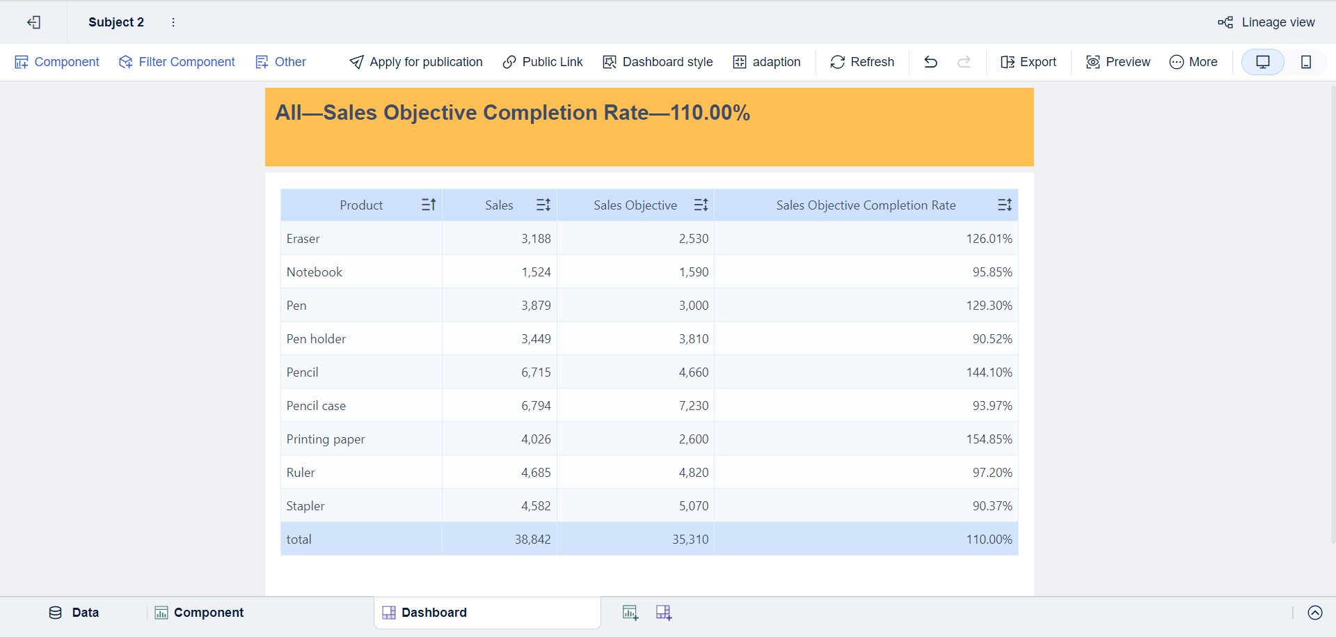 First insert the Product Name from the Current Subject, and then insert the filter component value from the current dashboard, as shown in the following figure.