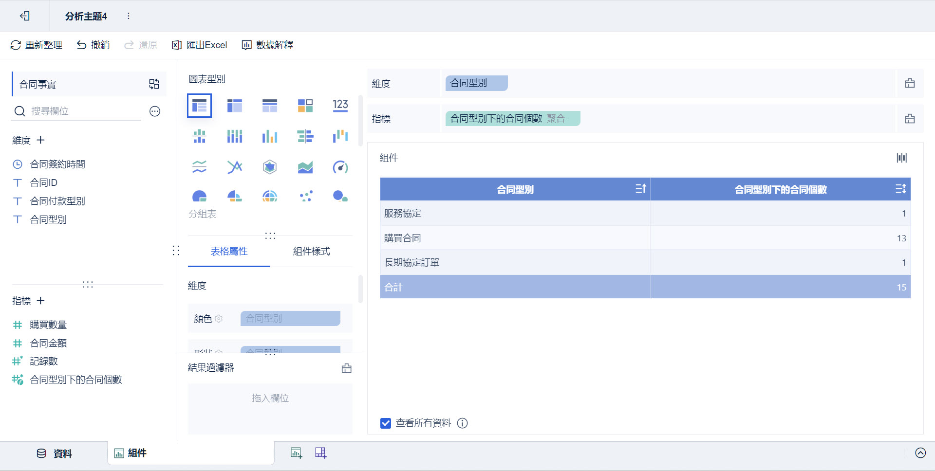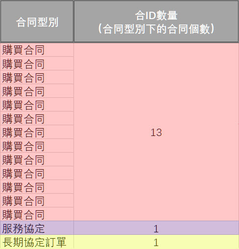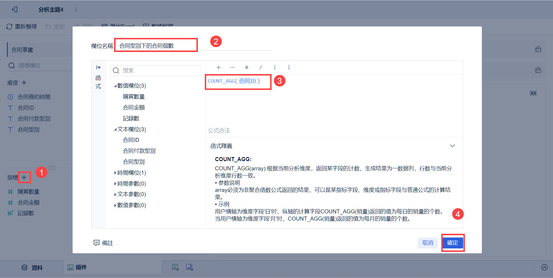想要建立一個列來顯示每個「合同型別」中有多少「合同ID」,使用公式:COUNT_AGG(合同ID),如下圖所示: