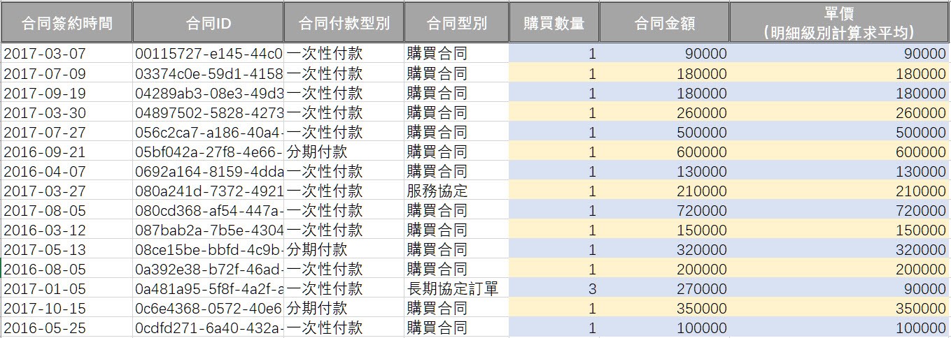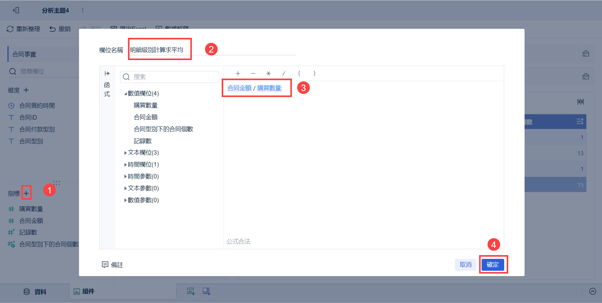 使用「合同事實」,新增計算欄位「明細級別計算求平均」,直接使用公式合同金額/購買數量,如下圖所示: