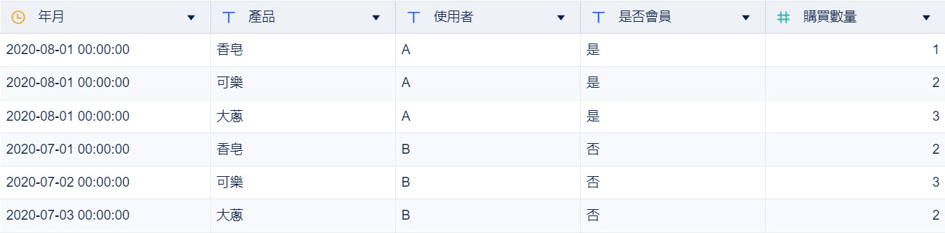 例如,求不同年月會員,每個產品購買數量。分析區域已有維度欄位:年月。