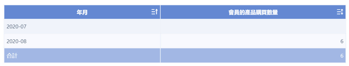 以產品、年月作為分組維度,過濾出會員的資料,對購買數量進行匯總計算。表內資料如下圖所示: