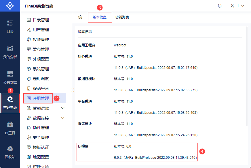 管理员可在「管理系统>注册管理>版本信息」下查看版本号,如下图所示: