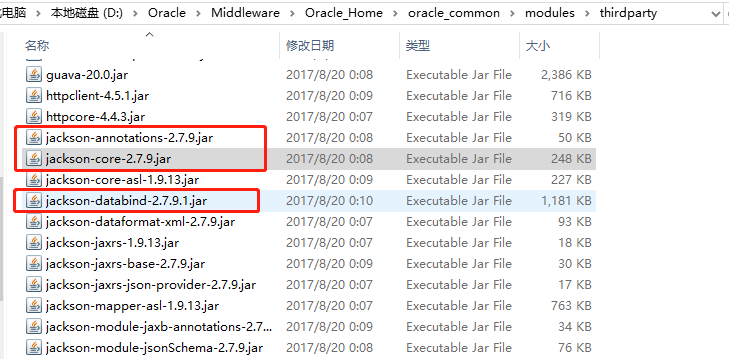 2)删除 weblogic 安装目录%Weblogic%/Middleware/Oracle_Home/oracle_common/modules/hirdparty 目录下的「jackson-annotations-2.7.9.jar」、「jackson-core-2.7.9.jar」、「jackson-databind-2.7.9.1.jar」三个 JAR 包,如下图所示: