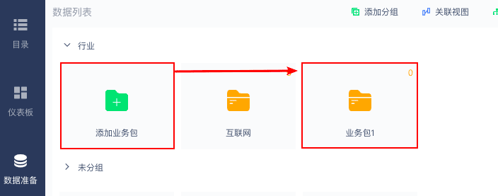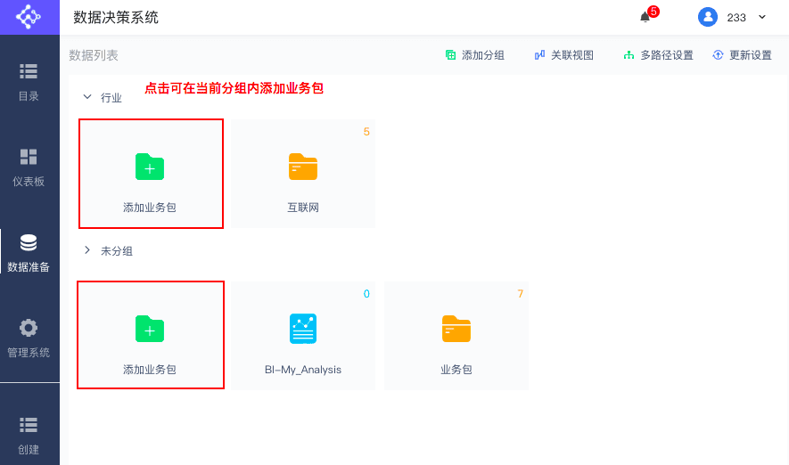进入FineBI数据决策系统,选择数据准备后可以看到目前已有的业务包和添加业务包按钮,如下图: