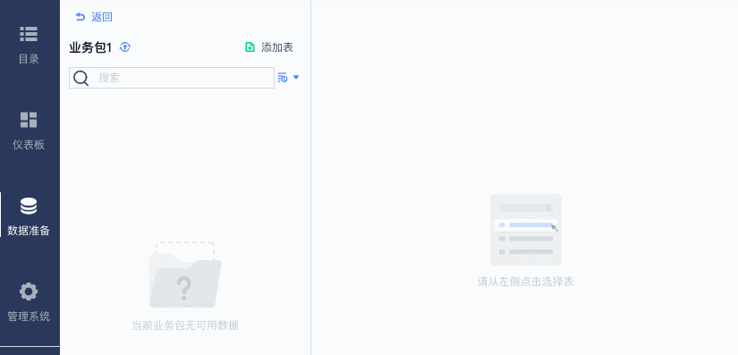 点击该新建的业务包,则会进入业务包编辑界面,可为新业务包添加数据表。数据表的操作可参考添加表。