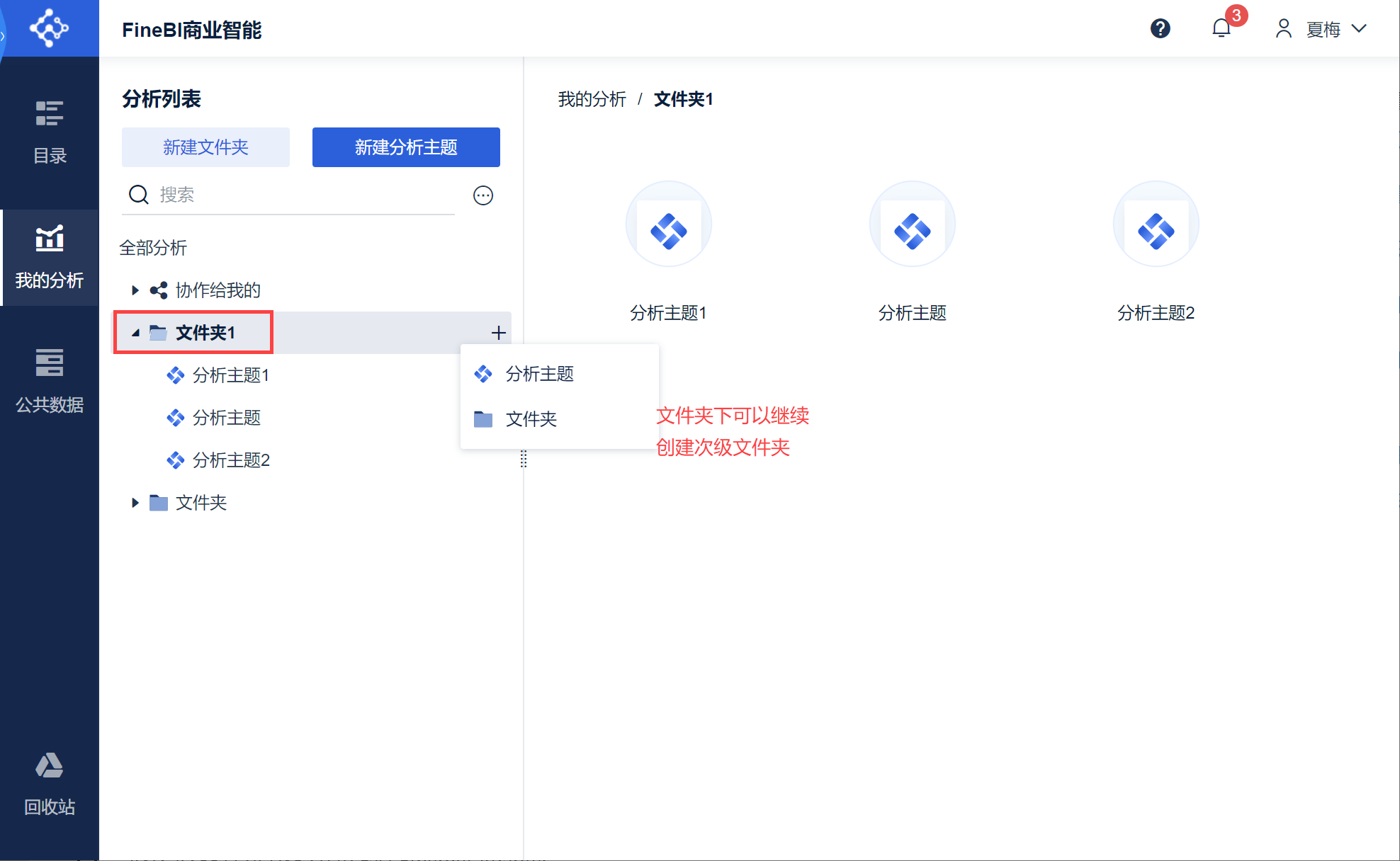 FineBI 支持通过文件夹分门别类的存放分析主题;