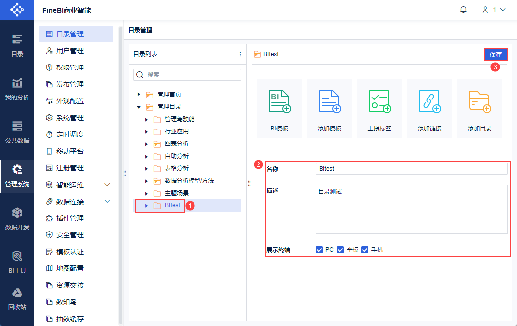 选中目录BItest ,右侧可以直接修改该目录的名称、描述、展示终端等设置,点击「保存」即可。如下图所示: