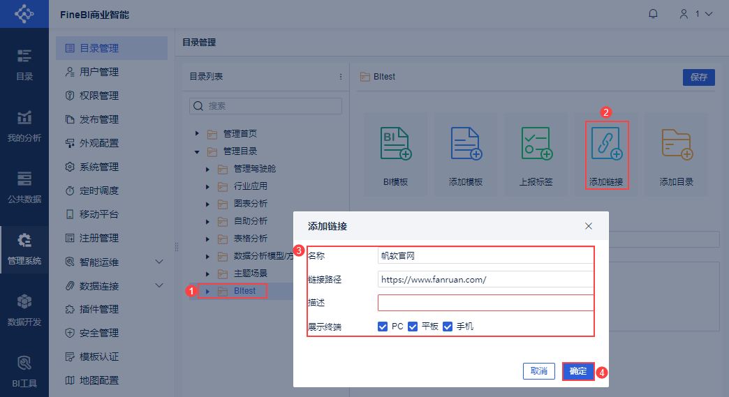 1)选中BItest目录,点击「添加链接」按钮,弹出添加链接对话框,名称输入帆软官网,链接路径输入https://www.fanruan.com/,如下图所示: