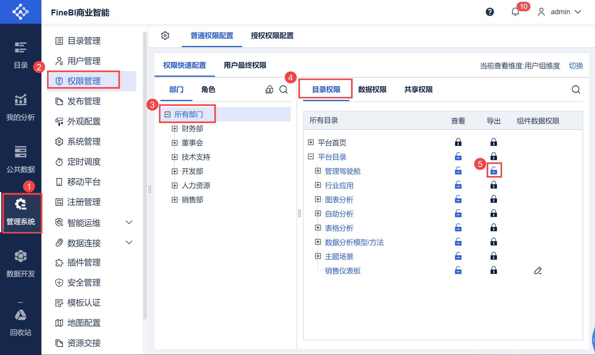 挂载到目录后导出,非管理员用户需要管理员开启目录导出权限才可以导出仪表板。如下图所示:
