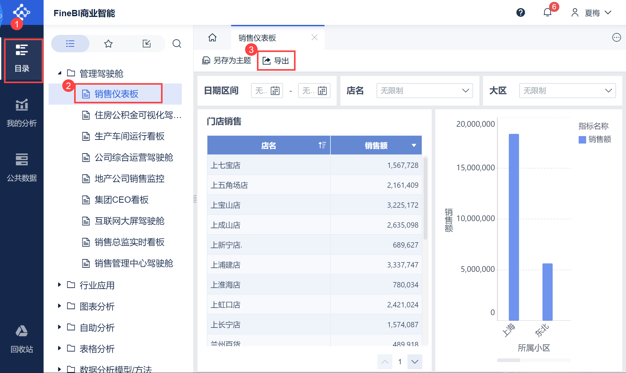 当用户需要将仪表板导出,保存数据和图表,进行一些其他处理或报告使用的时候,可以用到 FineBI 的导出功能。