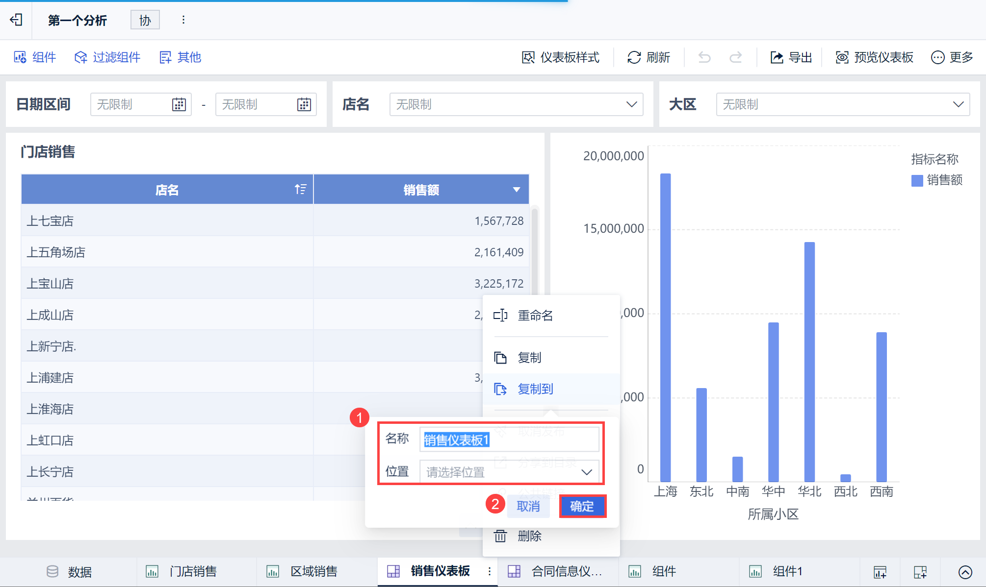 FineBI 支持将当前仪表板复制到当前分析主题或者其他分析主题中,复制的仪表板可以另行编辑,且不影响当前仪表板。